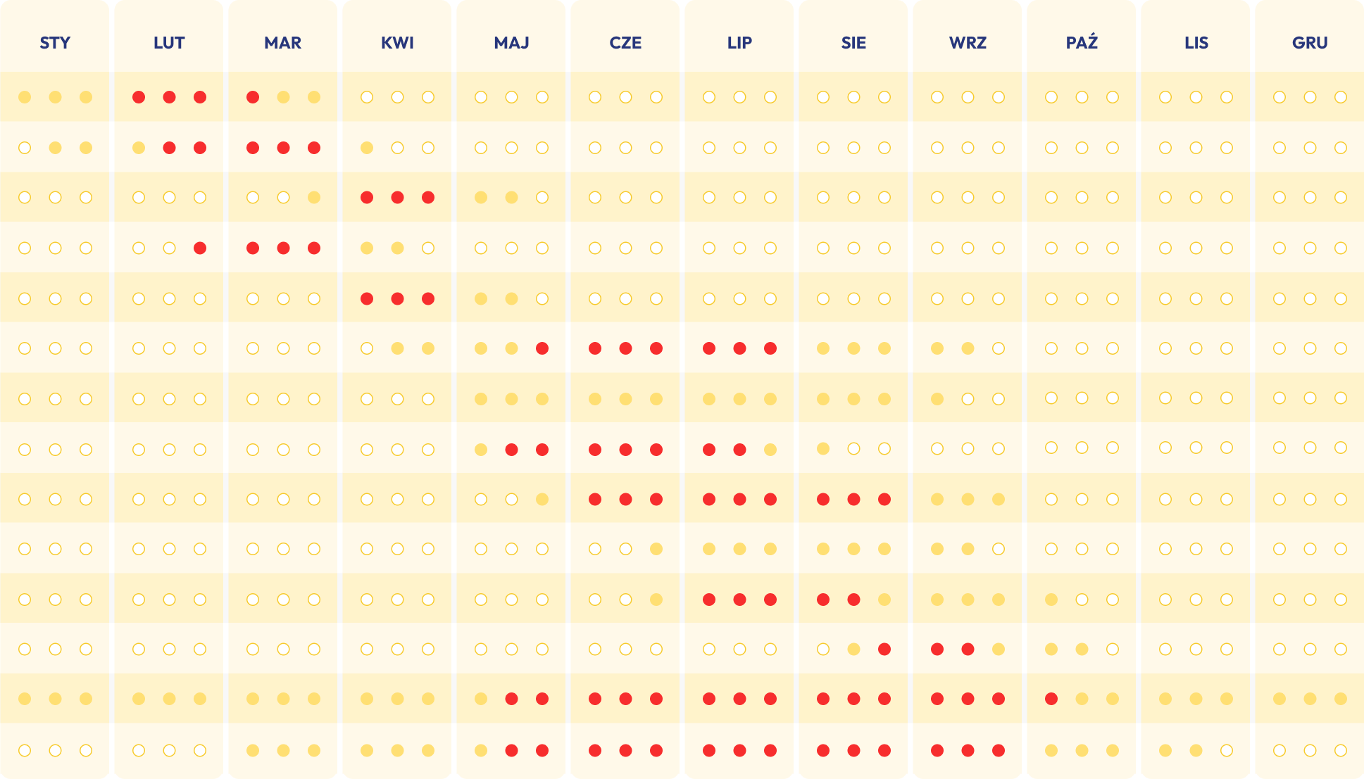 Poniższy kalendarz pylenia opracowano na podstawie kilkudziesięcioletnich pomiarów stężenia pyłku roślin, prowadzonych od 1989 roku przez Ośrodek Badania Alergenów Środowiskowych. Sezony pylenia w poszczególnych latach mogą różnić się od średnich wieloletnich.